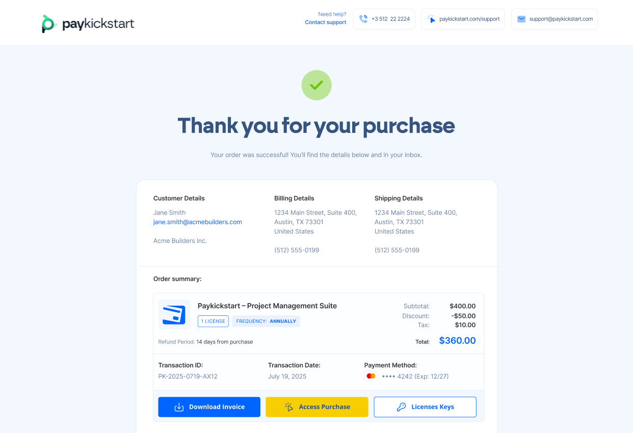 Actionable Access: Weβve improved the visibility of post-purchase actions. Customers can now easily find buttons to Download Invoices, Access Purchases, and retrieve License Keys right from the summary card.